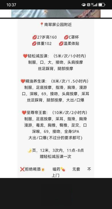 强烈推荐,见面就有感觉。做活细致,也不催人。口活无齿感,带上雨衣努力开炮,完事后聊会天 ...